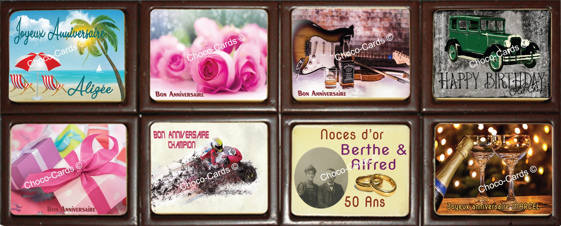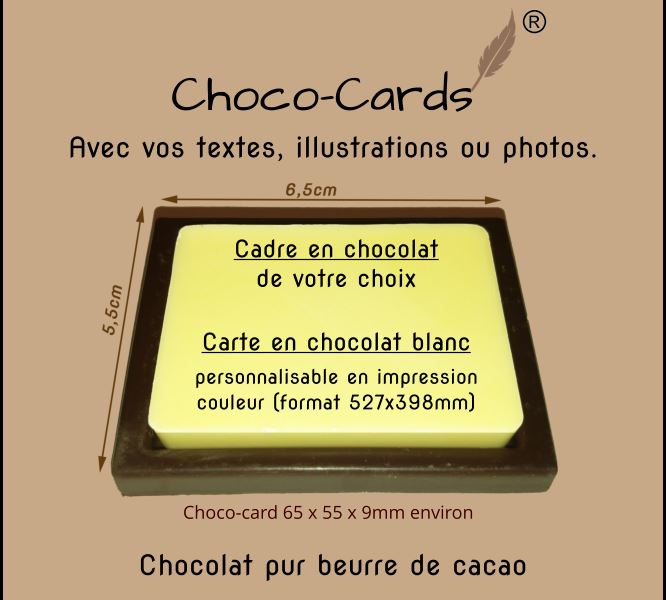 Les choco-cards ® se personnalisent pour toutes vos occasion, n'hésitez pas à consulter la galerie et à vous renseigner.